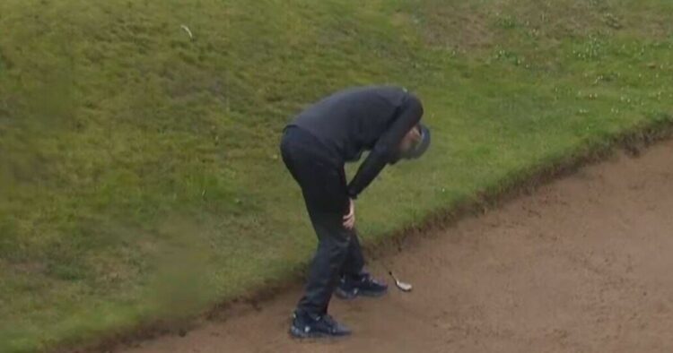 L’image de l’un des meilleurs athlètes de Grande-Bretagne qui riposte à une erreur de golf dans tout le bunker, avec un ongoker partageant l’instant.