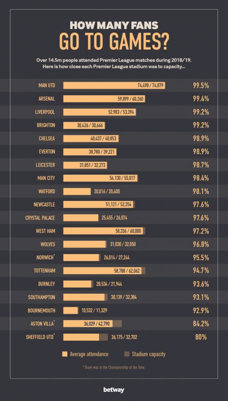 Selon des recherches menées par Betway Online, la moyenne de 52 983 spectateurs du club la saison dernière était la sixième plus élevée de l'élite.