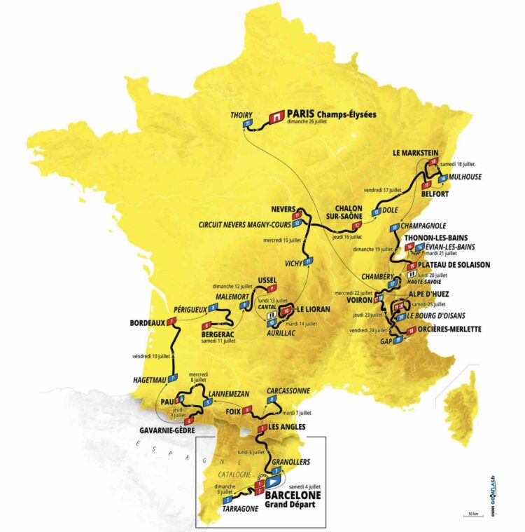 Christian Prudhomme a dessiné une traversée de la France en crescendo parfait. Après la Catalogne, le peloton enchaînera 5 massifs montagneux : Pyrénées, Massif central, Vosges, Jura et Alpes. Avec seulement 26 km de contre-la-montre individuel, les organisateurs visent clairement à limiter les écarts trop précoces et à maintenir un peloton groupé jusqu’à l’ultime semaine.